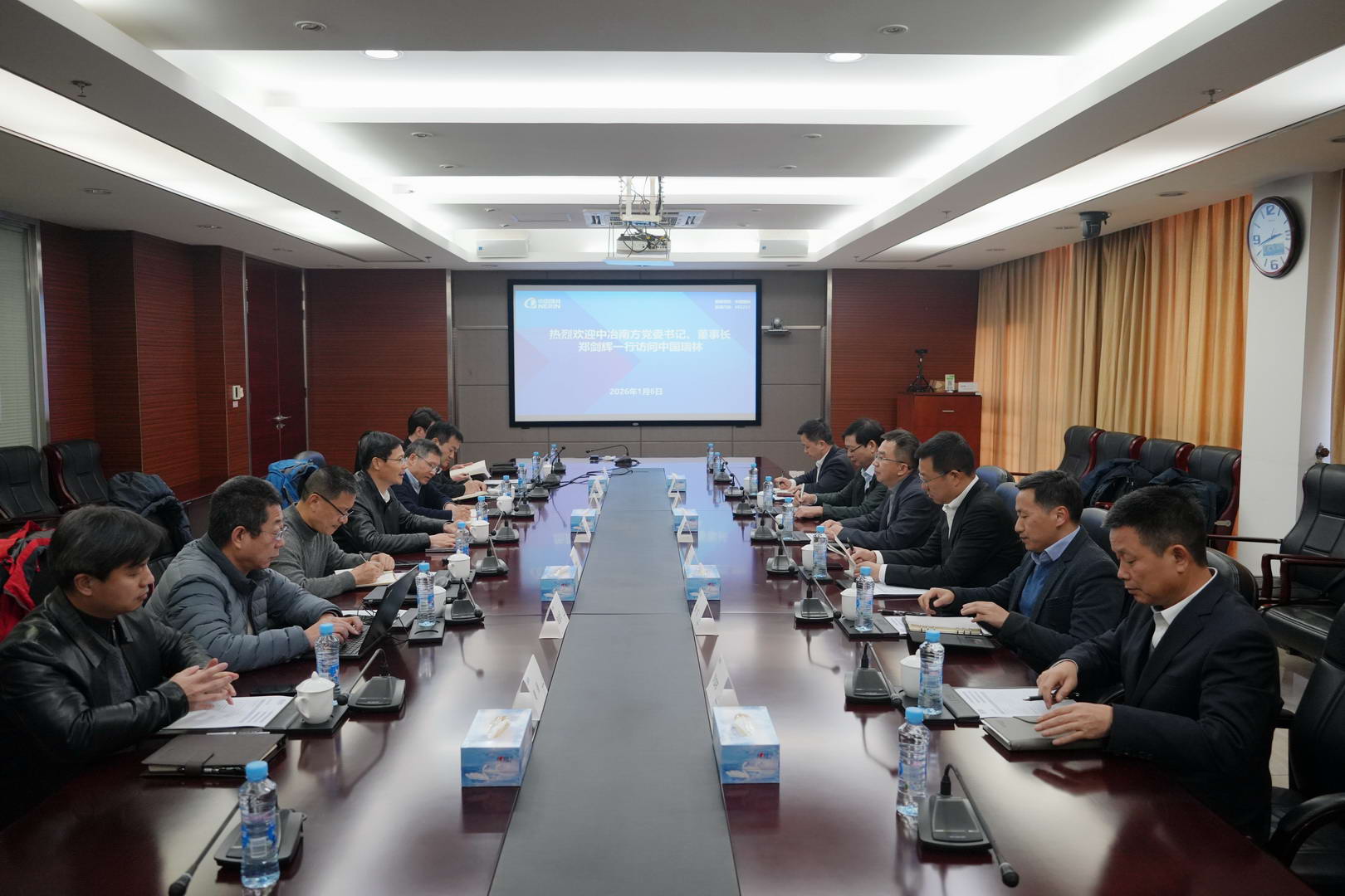 1月6日,中国瑞林党委书记、董事长、总经理吴润华在公司总部接待了来访的中冶南方工程技术有限公司(以下简称“中冶南方”)党委书记、董事长郑剑辉一行。双方围绕绿色冶金、资源循环利用、数智化转型、核心装备研发等关键领域的合作展开深入友好的交流。